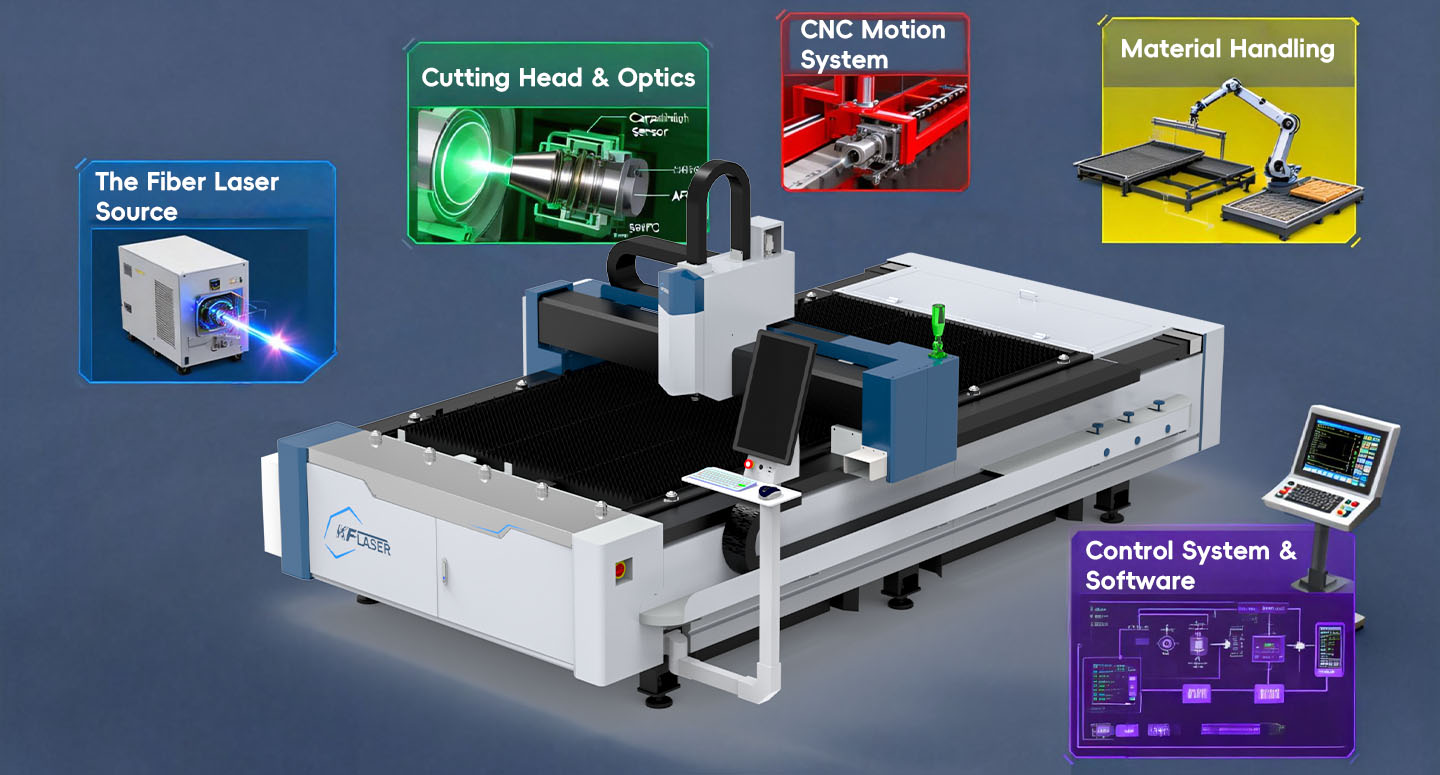 A modern fiber laser sheet cutting machine integrates several critical subsystems: